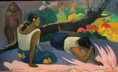 Короткое изложение судьбы художника: жил да был банковский служащий Поль Гоген и была у него датская жена (Мэти Софи Гад) и пятеро детей. Он был - француз. Жили они неплохо, или плохо....Но в один прекрасный момент муж-француз увлекся импрессионистами и решил начать рисовать. Поначалу это были просто плохие копии французов. А потом он уволился с работы.... А потом он бросил жену и детей, уехал на Таити, поселился в хижине и стал рисовать местных колоритных женщин. Женился ( или завёл?) себе таитянку...Там и умер... На Маркизских островах...